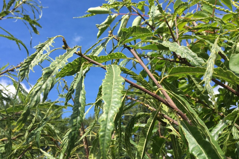 Die Blätter sind linear bis länglich, sehr länglich und schmal. Sie sind 10 bis 18 cm lang. Sie sind tief eingeschnitten und stark gezähnt und weisen ein unregelmäßiges Aussehen auf, das dem gesamten Baum seinen ganz besonderen Charme verleiht. Die Blätter sind dunkelgrün und glänzend, manchmal mit hellgrünen oder gelben Flecken, die ihnen ein sehr schönes marmoriertes Aussehen verleihen. Die jungen Blätter von Castanea sativa Aspleniifolia sind an der Unterseite tonnenförmig.