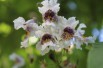 Im Juli bietet Trompetenbaum ein Blumenspektakel, indem er sich mit weißen, rotgestreiften Glöckchen schmückt. Diese ähneln den trompetenförmigen Blüten der Bignone (campsis), daher der Name Bignonioides.