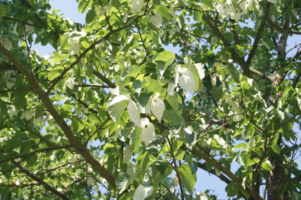 Der Taschentuchbaum ist ein aus Südwestchina stammender Baum mit sommergrünen, sehr kräftigen Blättern, die bis zu 14 cm lang werden und große Herzen bilden. Die Besonderheit dieser Art liegt jedoch in ihrer Blüte, die im Mai bis Juni den gesamten Baum bedeckt. Es erscheinen kleine Blüten, die von großen weißen Hochblättern umgeben sind. Dies sind eigentlich veränderte Blätter, die den Blütenansatz umschließen und eine sogenannte Involucrum bilden. Sie werden also zur Blütezeit zwei große, makellos weiße Blätter sehen, die jede Blüte des Baumes umgeben, das Bild ist atemberaubend.