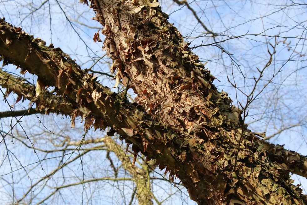 Die Schwarz-Birke verdankt ihren Namen ihrer besonders dekorativen, schwarzbraunen und rot schimmernden Rinde, die sich in Blätter auflöst und einen grau-orangefarbenen Stamm freigibt.