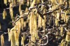 Corylus avellana Contorta gehört zur Familie der Betulaceae. Sie stammt aus den gemäßigten Zonen der nördlichen Hemisphäre und ist aus einer Mutation der Gemeinen Hasel hervorgegangen. Er wurde um 1863 in England entdeckt. Die Korkenzieher-Hasel wächst langsam und erreicht bei Reife eine Höhe von etwa 3 Metern und eine Ausbreitung von 2 Metern. Sein Laub ist sommergrün, dunkelgrün, leicht gekräuselt und gezähnt. Es nimmt im Herbst eine schöne goldgelbe Färbung an. Seine Blüten sind einhäusig, d. h. er trägt sowohl männliche als auch weibliche Blüten am selben Fuß. Die männlichen Blüten sind hängende, 5 cm lange Kätzchen von leuchtend gelber Farbe, die zwischen Februar und März erscheinen. Die weiblichen Blüten, die im März/April erscheinen, sind unauffälliger, rötlich und befinden sich an den Enden der Zweige. Die Blütezeit liegt vor dem Austreiben der Blätter im Mai. Eher dekorativ als ein Obststrauch, ist sein Fruchtbehang nicht sehr üppig. Die Früchte sind essbare Haselnüsse, die in einer grünen, behaarten Hülle eingeschlossen sind.