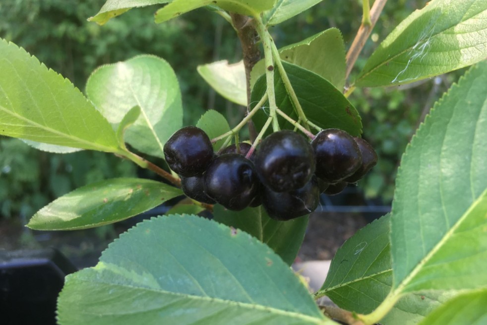 Die Aronia prunifolia Viking oder Apfelbeere Viking ist ein Laubstrauch, der von April bis Mai wunderschöne Büschel weißer Blüten hervorbringt, die selbstfruchtbar sind und Honig produzieren. Ihnen folgen essbare schwarze Beeren, die größer und weniger säuerlich sind als die der Typusart. Seine Blätter nehmen im Herbst orangerote bis purpurrote Farbtöne an, was ihm das ganze Jahr über einen dekorativen Reiz verleiht. Es ist eine rustikale Pflanze, resistent gegen Krankheiten und Parasiten, die sich an alle Bodenarten und Belastungen anpasst.