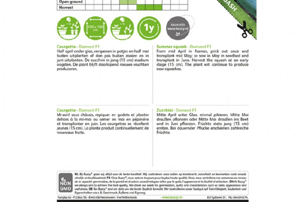 Der Zucchini Diamant ist eine frühe und sehr ertragreiche Sorte mit glatten, dunkelgrünen, zylindrischen Früchten. Das feste Fruchtfleisch eignet sich hervorragend für die Küche.
