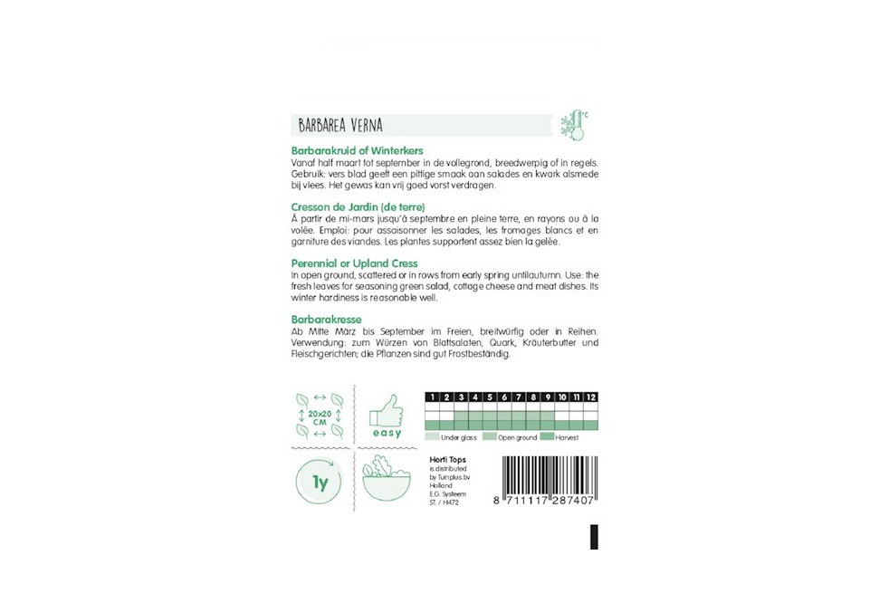 Die Barbarakresse ist eine robuste, mehrjährige Pflanze, ideal für den Gemüsegarten. Ihre zarten, leicht scharfen Blätter bringen Frische und Geschmack in Salate, Sandwiches und warme Gerichte. Sehr pflegeleicht, selbst aussäend, und bietet eine frühe Ernte ab Frühjahr.