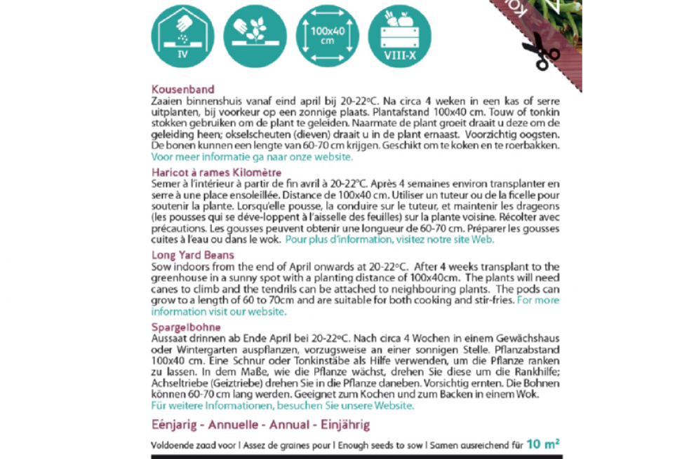 Geschmacklich ist sie ein echtes Feinschmecker‑Gemüse. Jung geerntet ist sie vollständig fadenlos, knackig und besitzt ein feines Aroma, das an Spargel und Haselnuss erinnert, mit einer festen Textur, die beim Kochen hervorragend erhalten bleibt. Ein Klassiker der asiatischen Küche, ideal für schnelle Zubereitungen im Wok. Der Anbau der Spargelbohne ist eine kulinarische Reise und zugleich eine Möglichkeit, eine äußerst produktive Pflanze zu kultivieren, die selbst extreme Hitze problemlos verträgt. Perfekt, um die Ernte auf originelle Weise zu bereichern.