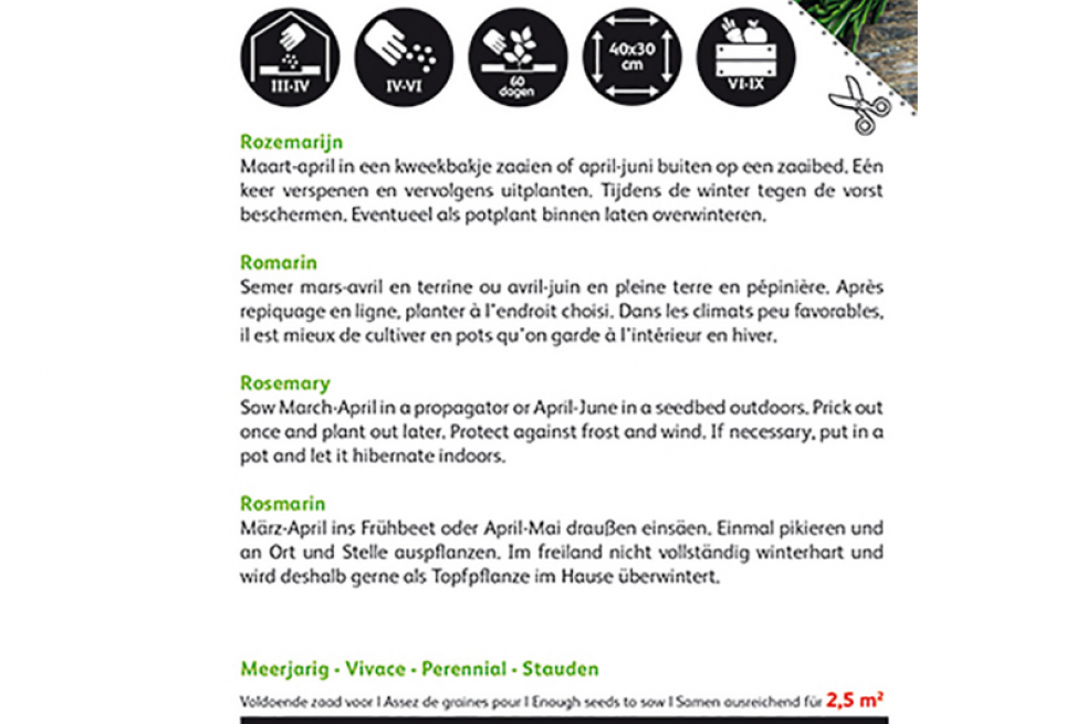 Le romarin s'accommode de tout type de sol bien drainé et exposé au soleil, comme sa compagne le thym. Semez les graines au printemps (mars-avril jusque juin) sous abri tempéré dans un mélange de terreau et de sable. Lorsque les plantules apparaissent, éclaircissez pour qu'elles se développent. En automne, repiquez les plants dans votre jardin. Vous récolterez les tiges l'année suivante.