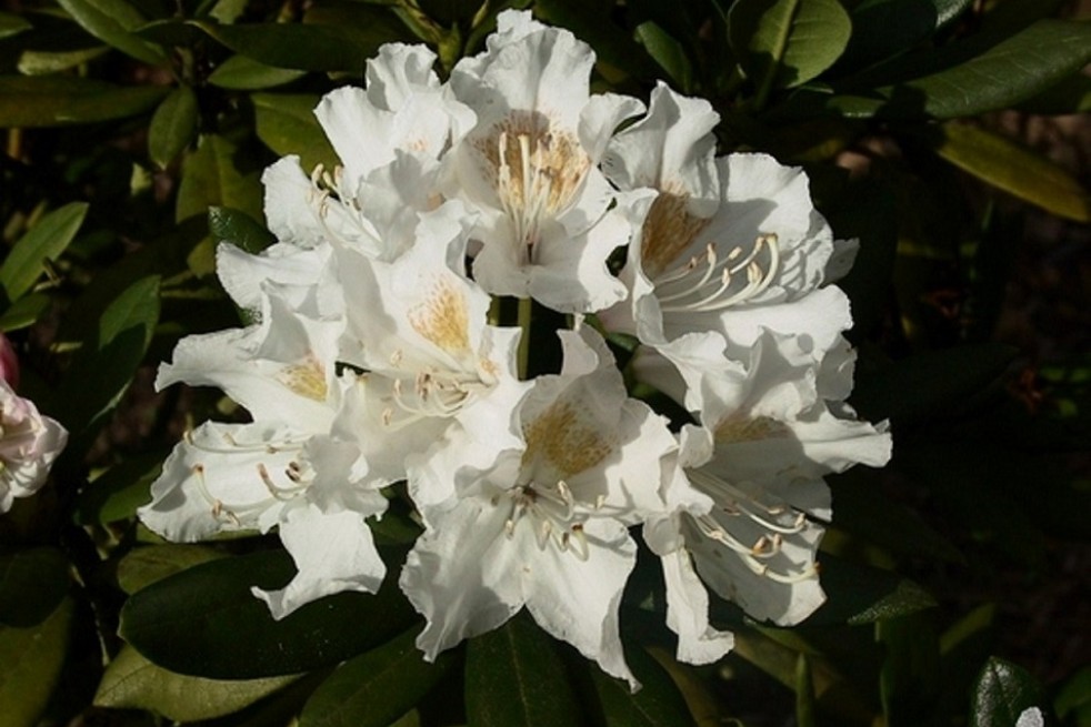 Rhododendron Cunningham's White is an old variety, originally from Scotland, adapted to harsh climates and difficult terrain. Its main asset is its wonderful flowering in May-June, which offers generous bunches of white flowers with a light yellow-green macula, these inflorescences have pointed petals with wavy edges. This compact, regular shrub has glossy, deep green evergreen foliage and pinkish flower buds, which develop into a multitude of flower clusters.