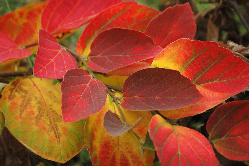 Foliage: Deciduous; rounded, slightly toothed leaves, glossy green in spring, turning red, orange and yellow in autumn