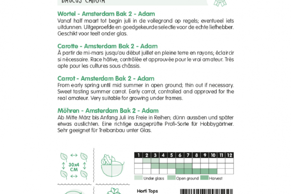 Amsterdam Adam is a very early carrot known for its tender texture and sweet flavour. A great choice for early sowing and quick spring harvests. Perfect for eating raw or lightly cooked.
