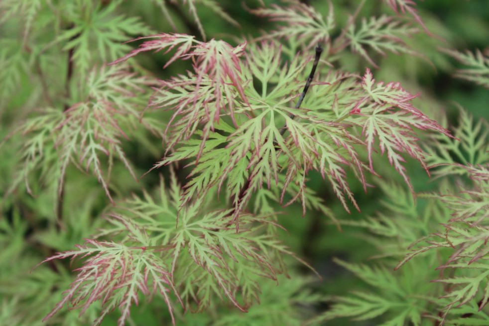 Acer palmatum dissectum Emerald Lace is remarkable not only for its graceful foliage, but also for the delicate, decorative appearance of its cream-streaked green bark.