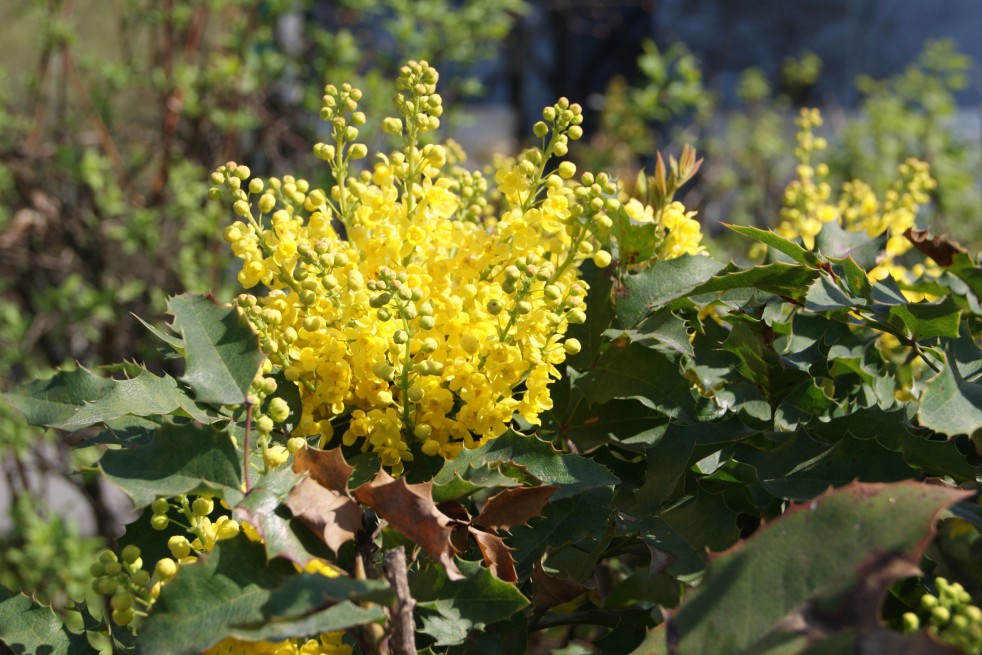 The Oregon grape is an ornamental spring flowering shrub from February to March, its foliage is bright and evergreen, looking like holly.