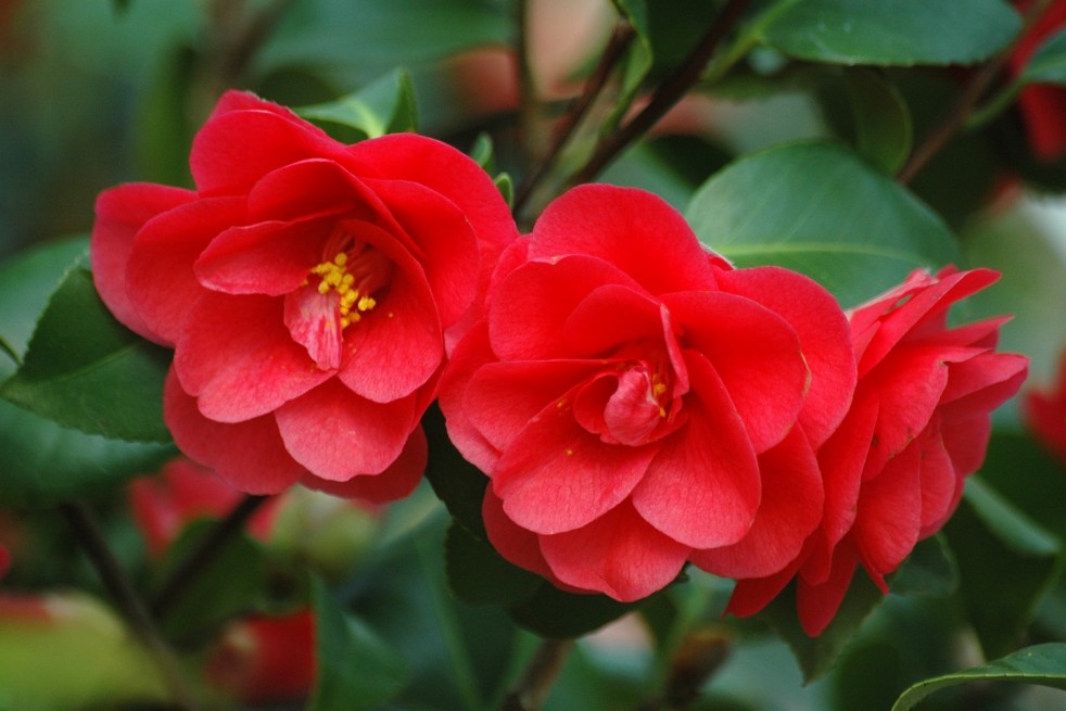 - Fleurs : Grandes fleurs semi-doubles, rouge rosé lumineux avec étamines jaunes apparentes