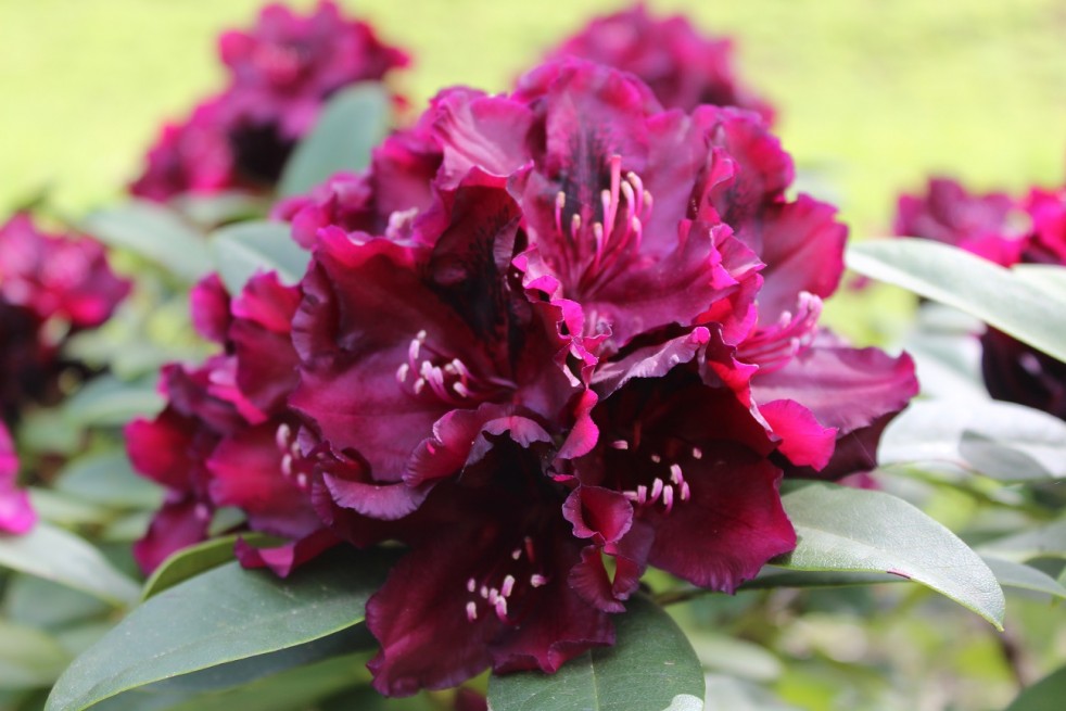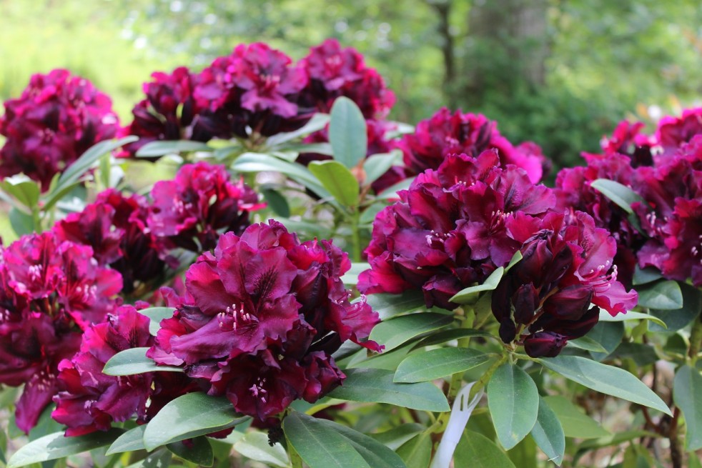 Le Rhododendron Midnight Beauty peut atteindre 1,50 m à maturité. Ses feuilles persistantes allongées, vert clair, contrastent merveilleusement avec sa floraison pourpre presque noire.