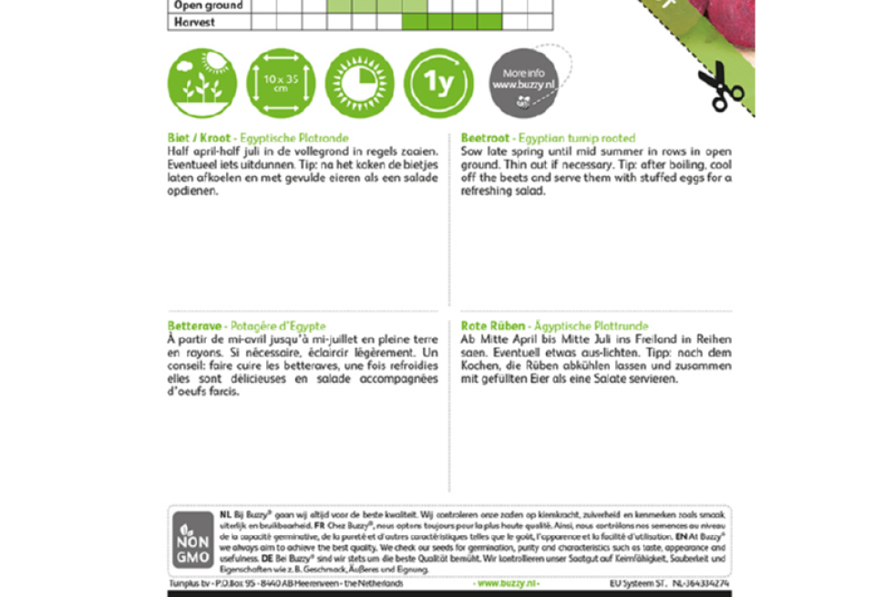 La betterave plate d’Égypte se sème généralement au printemps, de mi-avril à mi-juillet. Pour une récolte continue, il est conseillé d’échelonner les semis toutes les deux semaines. Cette variété préfère les sols frais, légers et riches en matière organique. Évitez les sols trop caillouteux ou calcaires.