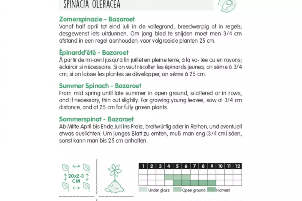 Semer les épinards d'été à partir de mi-avril jusqu’à fin juillet en pleine terre en ligne (espacement pour récolte de jeunes feuilles tout les 3 à 4 cm, pour récolter plus tard tout les 25 cm)