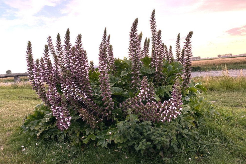 L’Acanthe à feuilles larges peut atteindre jusqu’à 1,2 à 1,5 m de hauteur lors de la floraison, avec un étalement de 80 cm à 1 m.