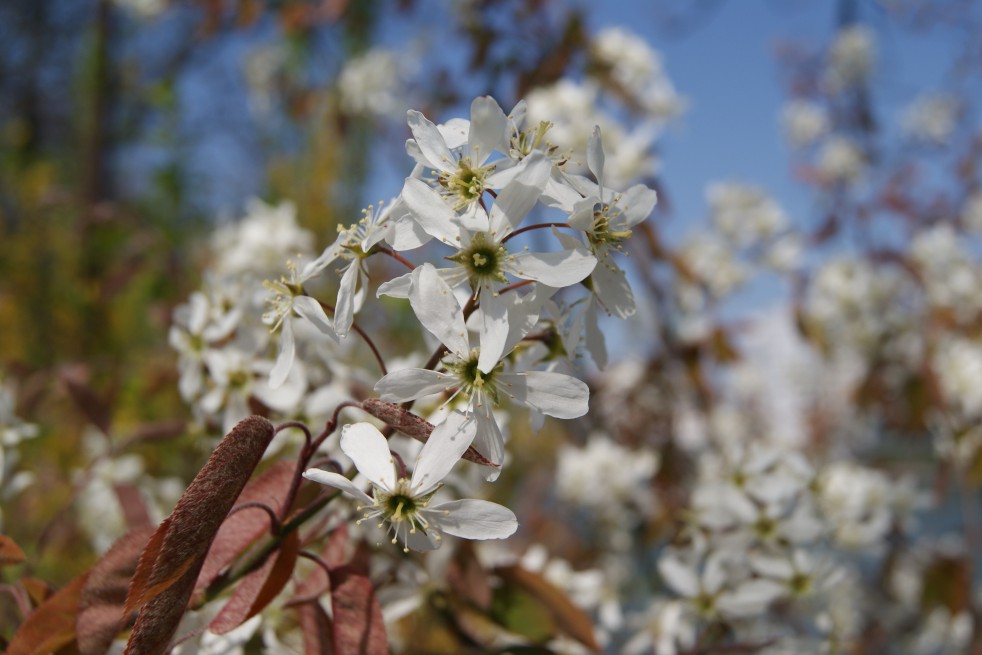 Amelanchier canadensis Glenform Rainbow Pillar is een zeer rijkbloeiende zuilvormige sierheester die door de seizoenen heen voor een oogverblindend schouwspel zorgt. In het voorjaar is hij bedekt met witte stervormige bloemen, gevolgd door donkerrode eetbare vruchten die zwart worden als ze rijp zijn. Het donkergroene blad kleurt in de herfst oranjerood tot paars, voordat het valt en de zilvergrijze takken zichtbaar worden. Deze krentenboompje onderscheidt zich door zijn slanke, zuilvormige vorm, waardoor hij zich aan kleine ruimtes kan aanpassen. Het bereikt ongeveer 4 meter hoog en 1,5 meter breed.
