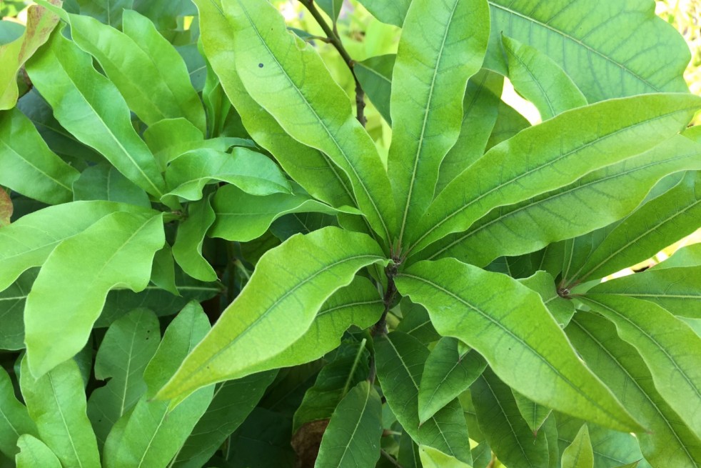 Met een langwerpige ovale vorm zijn de bladeren 7 tot 17 cm lang en 2,5 tot 5 cm breed en lijken ze sterk op die van de laurier. De bovenkant van het blad is donkergroen en glanzend van kleur, de onderkant is lichtgroen, de rand is licht golvend. De hoofdnerf is roodbruin.