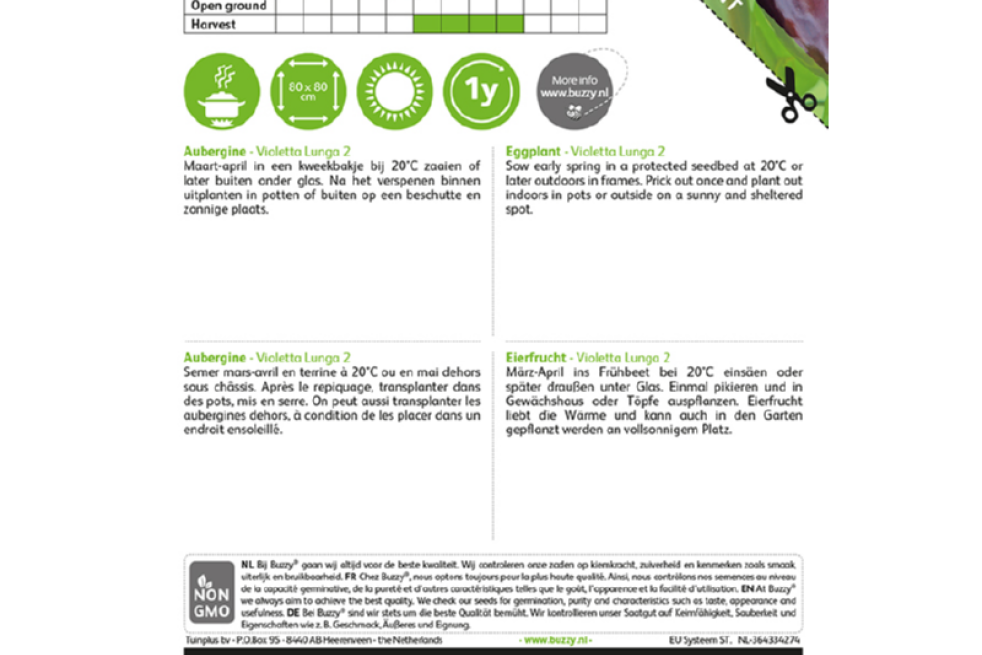 Vroege Paars Auberginezaden ontkiemen over het algemeen binnen 8 tot 10 dagen, mits je een constante temperatuur rond de 25 °C aanhoudt. Gebruik indien nodig een warmtemat om een snelle en gelijkmatige ontkieming te garanderen.